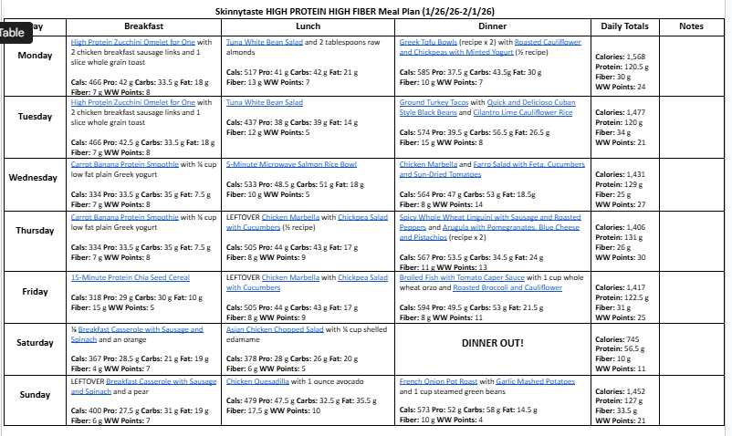A free, 7-day high protein, high fiber diet meal plan including breakfast, lunch and dinner ideas and a shopping list. All recipes include macros and Weight Watchers points.