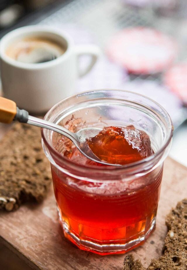 Any foam scraped off the top of the jelly while cooking can be refrigerated or frozen, and added to your next batch of jam. It’s especially great used in jams made with low-pectin fruit, such as strawberries, apricots, peaches, pineapple, or cherries.