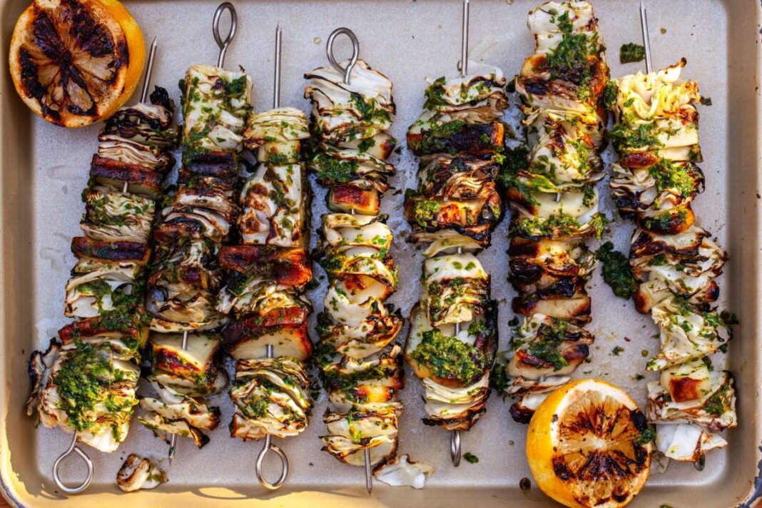 These cabbage and halloumi skewers, like me, have their feet in both seasons: a heartier, warming vegetable but with flavors that still taste like weather warm enough to eat outside. If you haven’t grilled cabbage before, you’re in for a treat. Even on the most pathetic gas grill (i.e. mine), the thick leaves get a little sweet, a little smoky, and — as we’ve learned via this charred salt and vinegar cabbage, this roasted cabbage with walnuts and parmesan, and this crispy cabbage and cauliflower salad — the more char, the better. Thin slices of salty halloumi are threaded between the chunks of cabbage and they, too, taste astoundingly good grilled. The cheese was, in fact, designed for it. Finally, we make an herby, punchy mixture with garlic, lemon, capers, and red pepper and brush it all over and then my husband and I stand in the kitchen and wolf it all down and forget why we’d want to eat anything else for dinner.