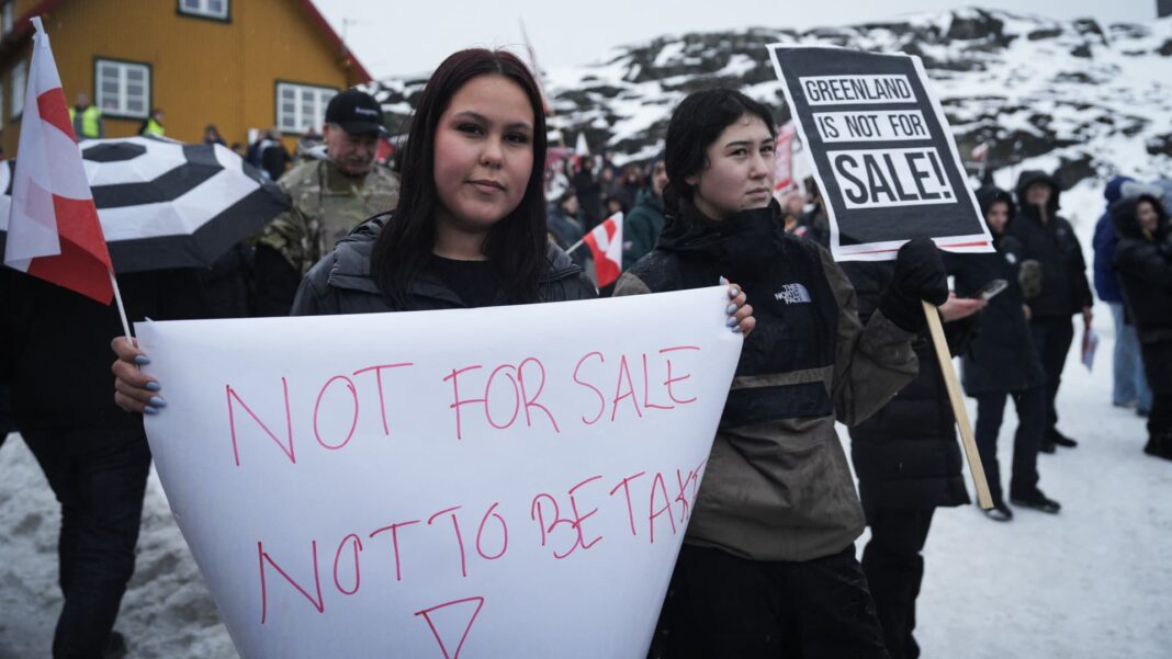 Young people with placards reading “Greenland is not for sale!” take part in a demonstration that gathered almost a third of the city population to protest against the US President’s plans to take Greenland, on January 17, 2026 in Nuuk, Greenland, near the US Consulate to Greenland.