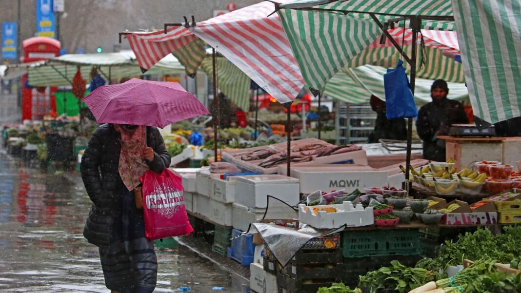 LONDON – March 31, 2023: A pedestrian shelters from the rain as they walk past fruit and vegetables displayed for sale at a market in stall east London. New data released on Weds, April 19 revealed that food and non-alcoholic beverage prices rose by 19.2% in the year to March 2023, the sharpest annual increase for more than 45 years.